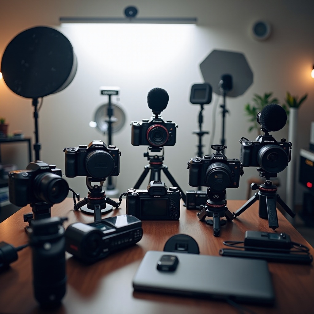 重要なアクセサリーには、音質向上のためのマイク、安定性のための三脚、ビデオ品質を向上させるための照明器具があります。